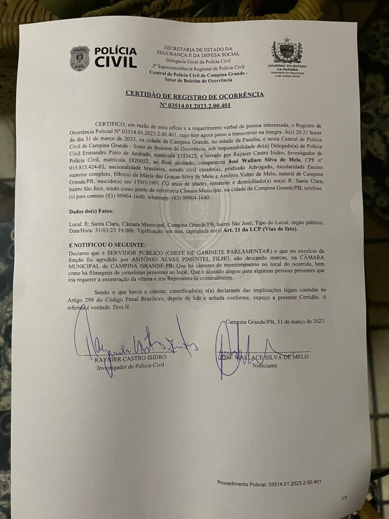 No boletim registrado na Polícia Civil, o assessor afirma que a suposta agressão “não deixou marcas”. Diz ainda que o vereador Pimentel Filho teria dito a algumas pessoas que iria requerer sua exoneração.