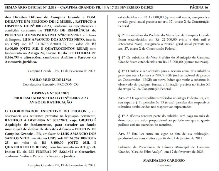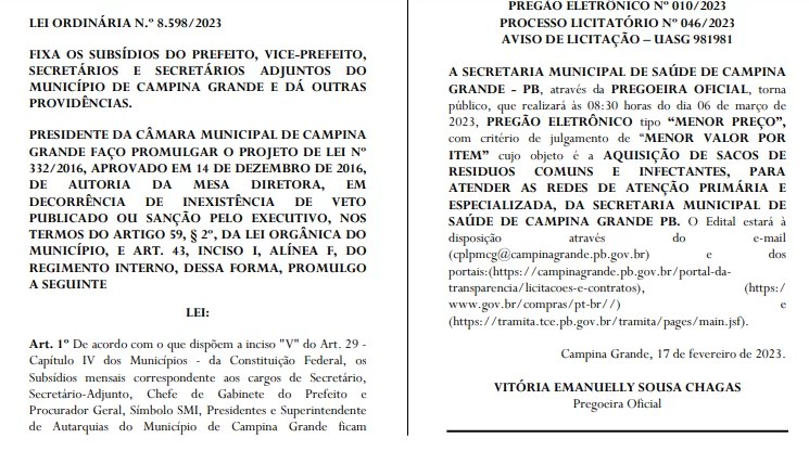A Mesa Diretora da Câmara de Campina Grande promulgou, semana passada, uma lei aprovada pela ‘Casa’ em 2016 que estabelece aumento nos salários do prefeito, vice, secretários municipais e adjuntos do município. Conforme a legislação, o prefeito passaria a receber R$ 22,7 mil e os secretários R$ 15 mil.