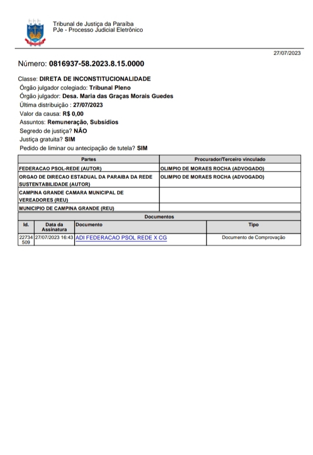 A Federação PSOL/Rede na Paraíba entrou com Ação Direta de Inconstitucionalidade no TJPB contra Emenda à Lei Orgânica de Campina Grande que vinculou aumento do subsídio do Prefeito Bruno Cunha Lima ao aumento do subsídio dos Ministros do Supremo Tribunal Federal.