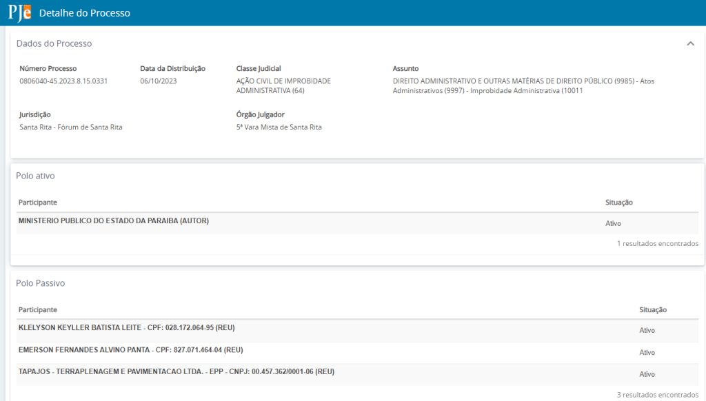 O processo nº 0806040-45.2023.8.15.0331 trata de uma “Ação Civil de Improbidade Administrativa” com um total de 5189 (cinco mil, cento e oitenta e nove) páginas e tramita na 5ª Vara Mista de Santa Rita.