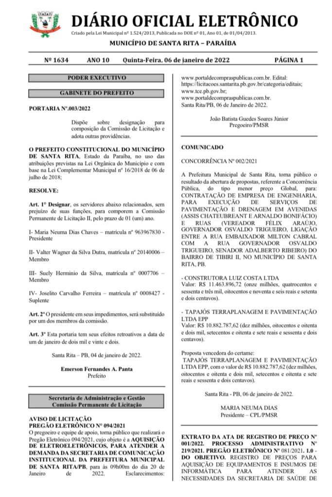 Confira a íntegra da confirmação da contratação publicada no Diário Oficial do Município no dia 06 de janeiro de 2022.