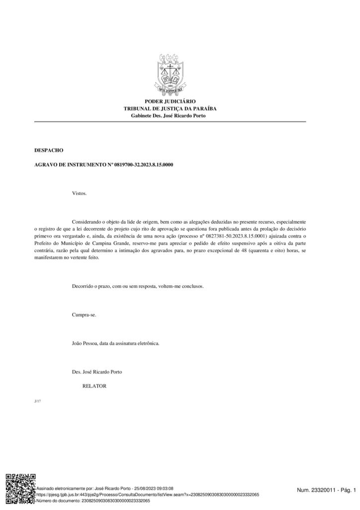 O desembargador José Ricardo Porto só vai se manifestar sobre o projeto de suplementação orçamentária no valor de R$ 13 milhões enviado pela Prefeitura de Campina Grande para a Câmara Municipal após ouvir os vereadores envolvidos no processo movido no Tribunal de Justiça da Paraíba (TJPB). Conforme apurou o ClickPB, o magistrado deu um prazo de 48 horas a realização das oitivas.