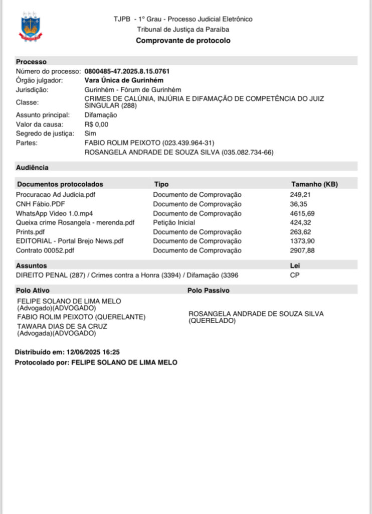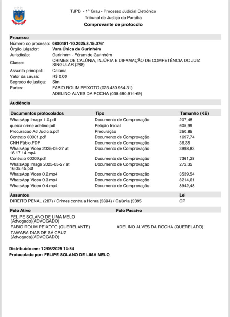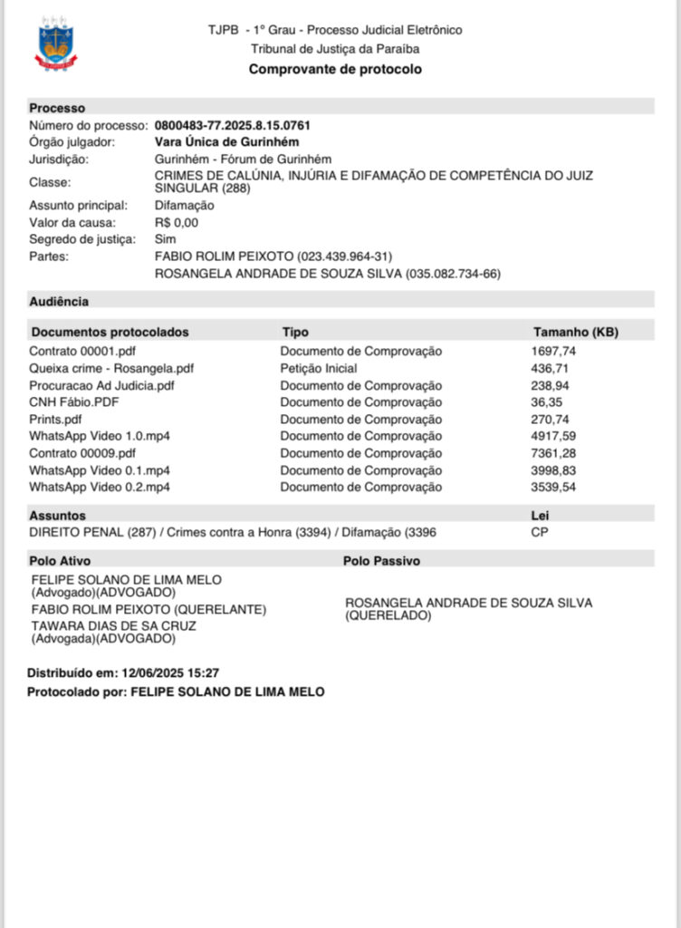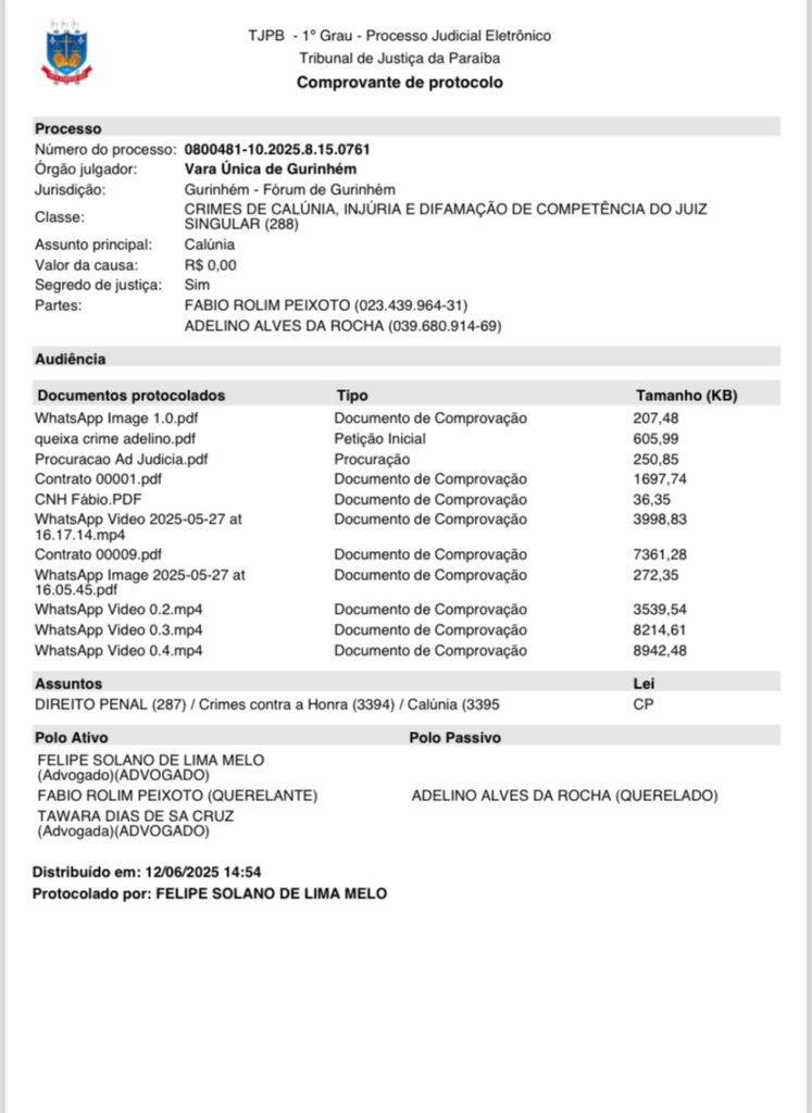 Nos últimos dias, três queixas-crime foram protocoladas na Vara Única da Comarca de Gurinhém, onde o prefeito figura como parte autora (querelante) em ações distintas. Os alvos são a própria vereadora Rosângela Andrade de Souza Silva e um segundo acusado, identificado como Adelino Alves da Rocha.