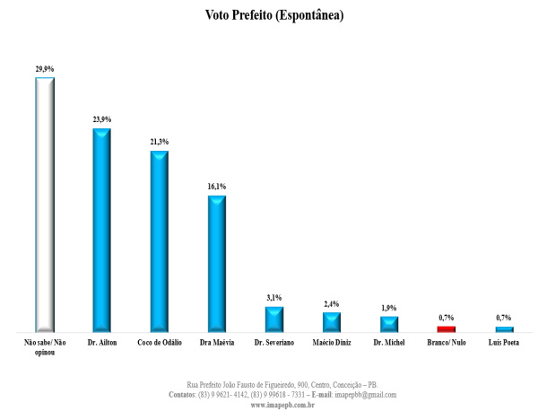 Outros nomes são citados na espontânea: Dr. Severiano (3,1%), Maécio Diniz (2,4%), Dr. Michel Suassuna (1,9%) e Luís Poeta (0,7%). Brancos ou nulos somam 0,7%, e 29,9% não sabem ou preferem não responder.