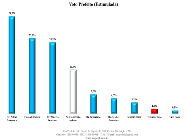 Em terceiro aparece Dra Maévia Suassuana aparece com 20,9% das intenções, seguida de Dr. Severiano (5,7%), Dr. Michel Suassuna (4,5%), Maécio Diniz (3,3%) e Luís Poeta com 0,9% das menções.