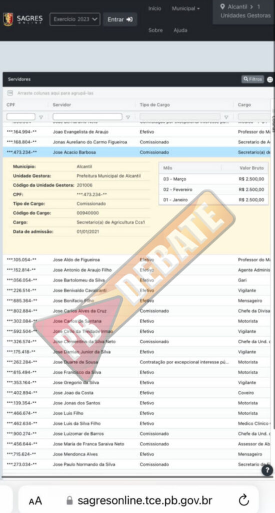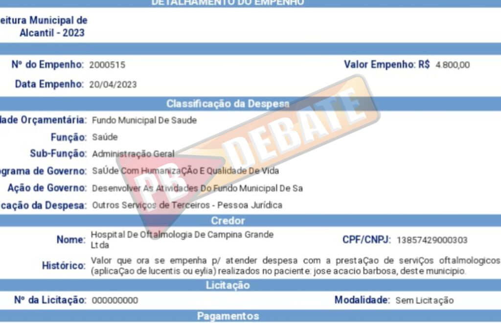 Com exclusividade o portal PB DEBATE, descobriu que a prefeitura de Alcantil deixou de fazer exames de pessoas carentes e baixa renda, para pagar o exame de vista do secretário de agricultura do município, José Acacio Barbosa, em uma clínica particular de Campina Grande, no valor de R$ 4.800,00 reais.