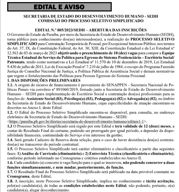 Estão abertas as inscrições para o processo seletivo da Secretaria de Desenvolvimento Humano do Estado para o preenchimento de dez vagas com salários de até R$ 3.318. conforme apurou o ClickPB, o prazo para os interessados se inscreverem é até 17 de novembro e devem ser feitas pela internet.