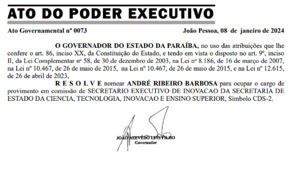 O Diário Oficial do Estado da Paraíba (DOE-PB) publicou na edição desta terça-feira (09/01) a nomeação do advogado campinense André Ribeiro Barbosa como secretário Executivo de Inovação da Secretaria de Estado da Ciência, Tecnologia, Inovação e Ensino Superior.
