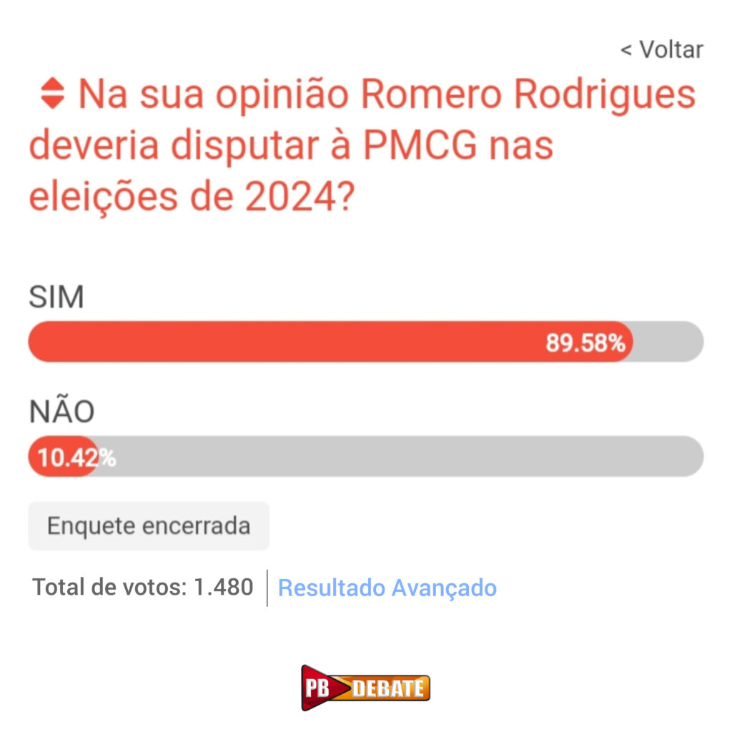 O Portal PB DEBATE, realizou uma enquete de quarta-feira (28/06) às 00:00hs desta sexta-feira (30/06) para saber se a população acha que Romero Rodrigues deveria ou não sair candidato a prefeito de Campina Grande em 2024