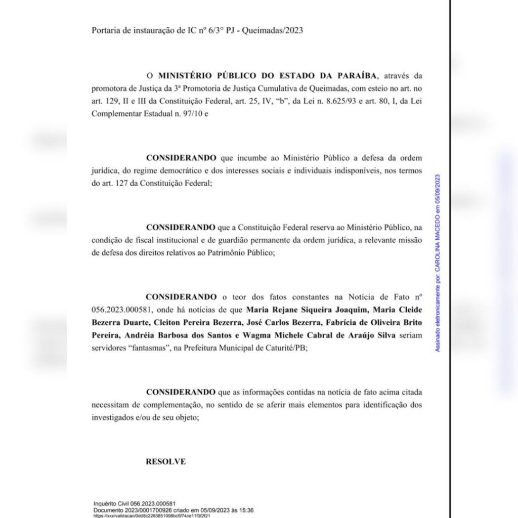 O Ministério Público da Paraíba, através da promotora de Justiça de Queimadas, Carolina Soares Honorato de Macedo, instaurou um inquérito civil público para apurar a denúncia de servidores fantasmas na Prefeitura de Caturité, na Paraíba. A portaria que determina a abertura do inquérito foi assinada nessa terça-feira (5).