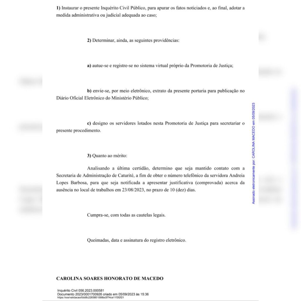 A promotora de Justiça determinou que sejam tomadas as providências necessárias para identificar os investigados e o objeto da investigação, bem como para notificar a servidora Andréia Lopes Barbosa, que teria faltado ao trabalho em 23/08/2023, sem justificativa. Ela terá o prazo de 10 dias para apresentar uma explicação comprovada sobre sua ausência.