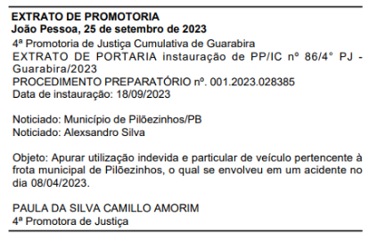 A promotora de Justiça, Paula da Silva Camillo Amorim, determinou a instauração de Procedimento Preparatório nº. 001.2023.028385 para apurar denúncia sobre suposta utilização indevida e particular de veículo pertencente à frota municipal de Pilõezinhos. O automóvel se envolveu em um acidente no dia 8 de abril deste ano.
