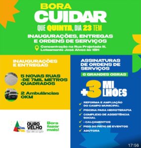 O prefeito de Ouro Velho, Dr. Augusto Valadares, entragará nesta quinta-feira (23), novas ações para o município, como também irá assinar ordens de serviço para a construção de importantes equipamentos para os ourovelhenses.